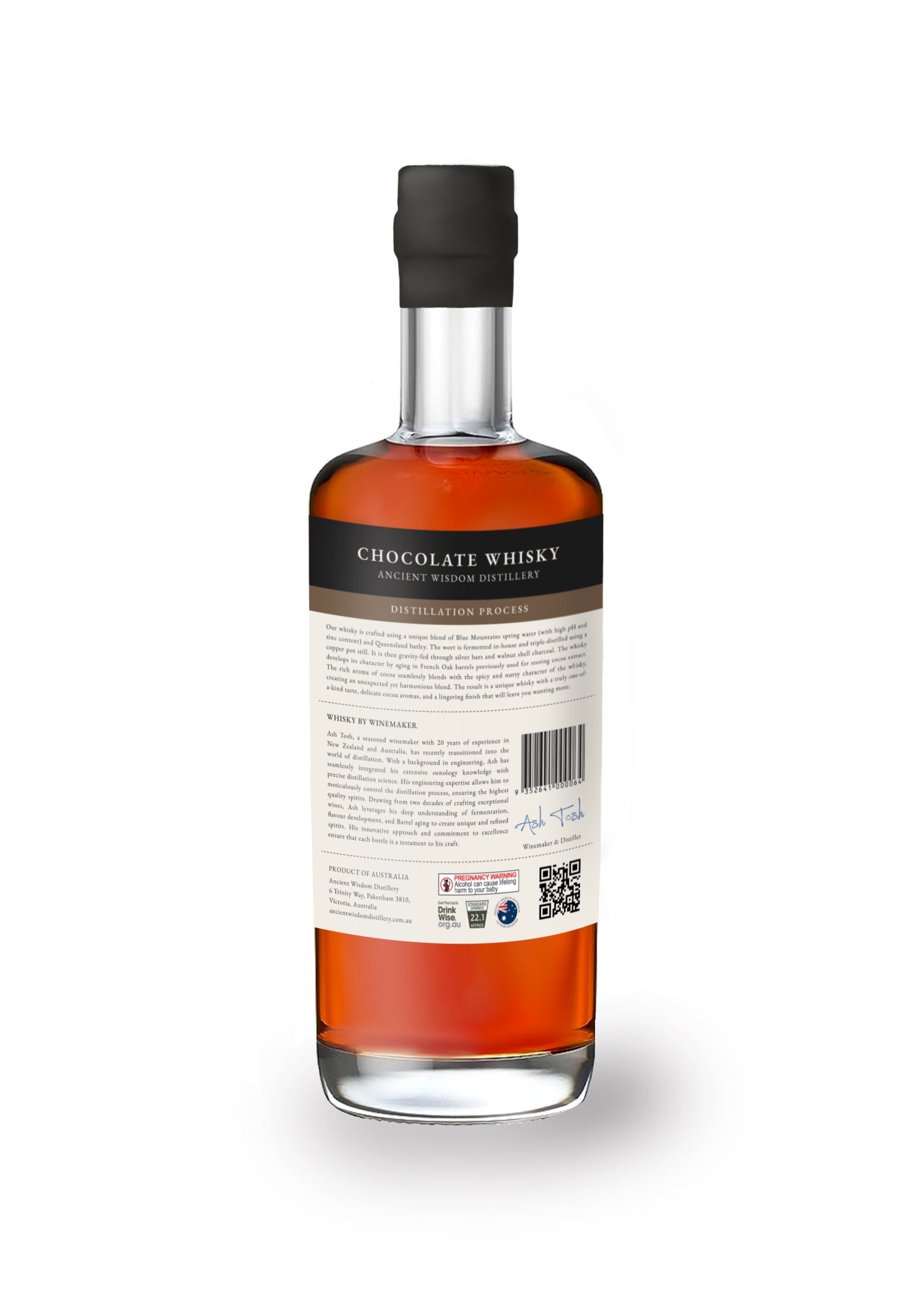 Indulge in the ultimate whisky experience, where rich whisky blends seamlessly with dark cocoa extract in a harmonious union. This sensory journey delights the palate with layers of rich chocolate flavours while preserving the whisky's core character. Notable for its dark-chocolate intensity and a luscious mid-depth, the blend features harmonious cocoa aromas intertwined with the whisky. Well-balanced oak tannins contribute to a textured, long-lasting finish. The complex layers work together to create a truly exceptional drink. Whether enjoyed neat as a dessert or used as a distinctive base for creative cocktails, this whisky offers a distinctive and memorable drinking experience for those seeking the perfect fusion of whisky and chocolate indulgence.